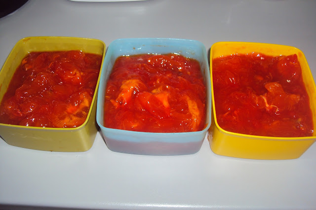 Comecei por lavar os dióspiros, retirei o pedúnculo e com uma colher retirei a polpa diretamente para pequenas caixas de congelação.